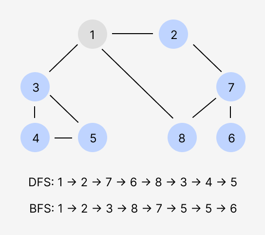 그래서 효율적인 탐색 알고리즘으로 접근해보자. 두 가지 방법이 있다. BFS와 DFS. BFS는 너비 우선 탐색으로 Queue 자료구조를 활용한다. 이름처럼 그래프를 시각적으로 봤을 때, 밑으로 내려가는 것이 아닌 옆으로 먼저 탐색하는 방법이다. DFS는 깊이 우선 탐색으로 Stack 자료구조를 활용한다. 그래프를 시각적으로 봤을 때, 갈 수 있는 가장 아래 노드까지 갔다가 올라오는 방법이다.