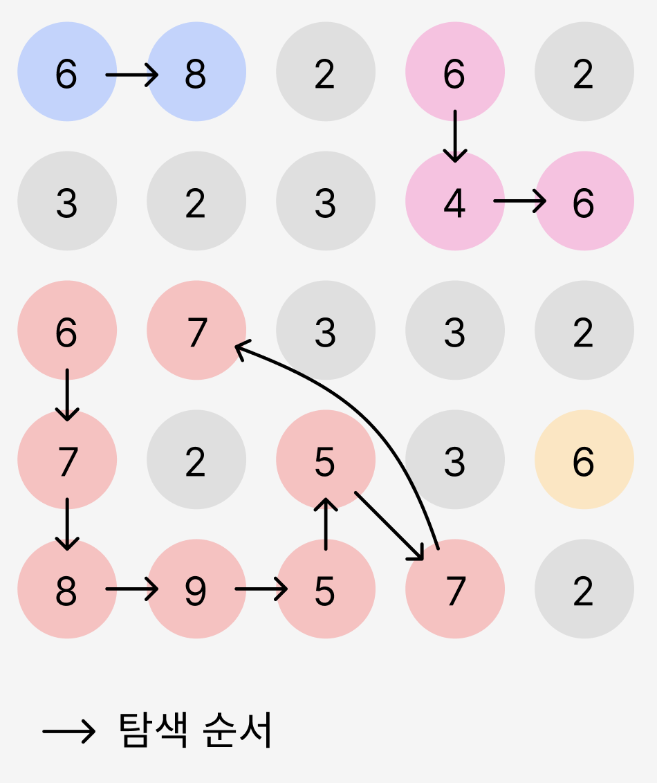 파랑, 분홍, 노랑 영역은 생략하고, 빨강 영역만 살펴보자. 먼저 (2, 0)인 6으로 시작한다. 그다음 상하좌우 순서이므로 아래쪽 7을 먼저 방문한다. 방문한 값에서 또 인접한 영역을 먼저 살피게 되므로, 아래쪽 8을 탐색한다. 순차적으로 9, 5를 방문한다. (4, 2)인 5에서 위쪽 5를 먼저 방문하고, 위쪽 5는 인접한 값이 없으므로 오른쪽 7을 방문한다. 그리고 잊지 말고 처음 6이 인접했던 (2, 1)인 7을 방문하고 끝낸다.
