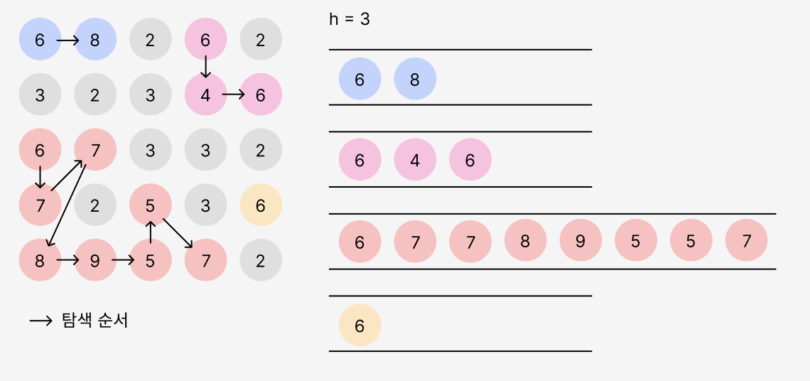그럼 BFS로 문제를 풀어보자. 풀이 방법을 대략 이해하기 위해 높이가 3일 때 과정을 쭉 살펴보자.