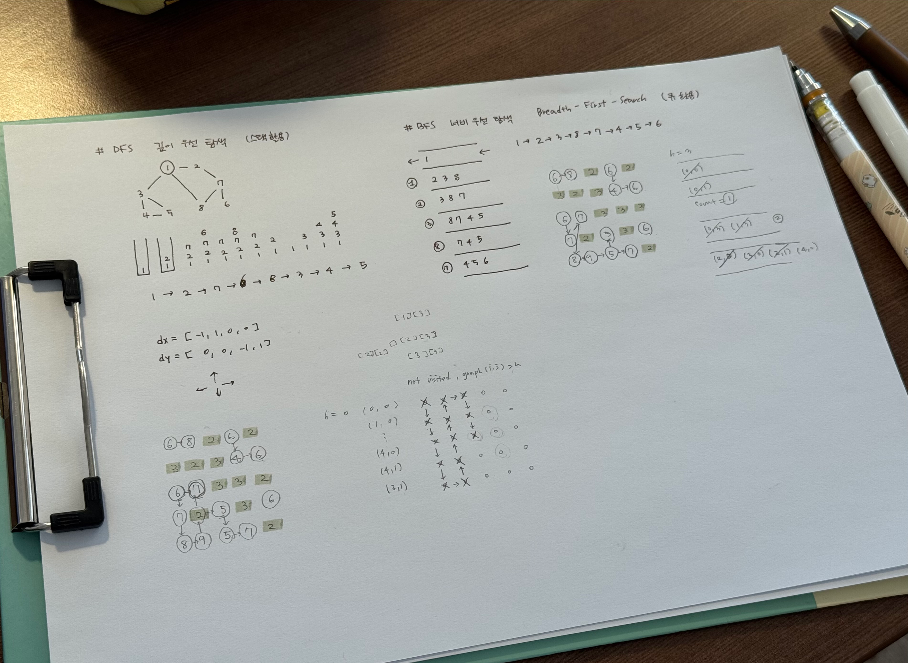 시간 복잡도는 BFS와 동일하다. 탐색하는 과정만 다를 뿐, DFS 또한 각 값들을 한 번씩만 방문하기 때문에 O(h x n^2)이 된다.